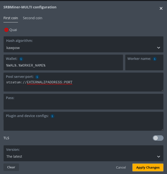 Quai,然后在下拉菜单中点击 Create Quai。 - 在 Address(地址)字段中,复制并粘贴你的 Quai 钱包地址。(该地址不会被矿工实际使用,因此这里可以填写任意地址。)