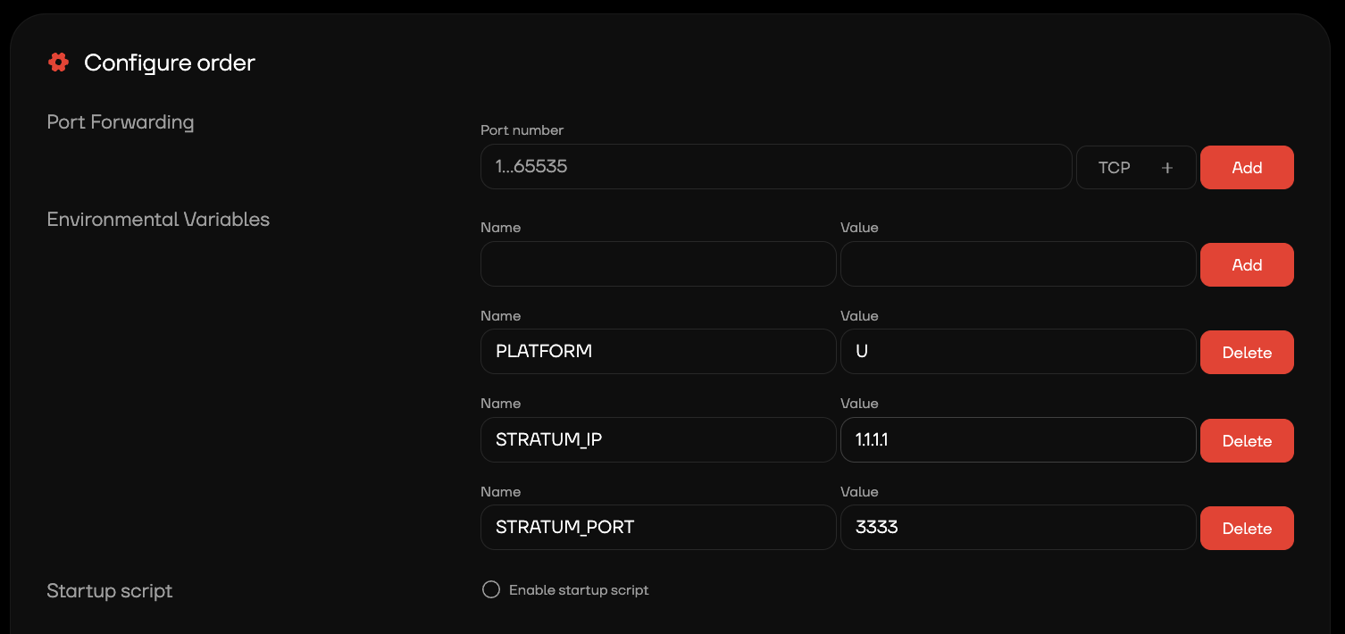 Configure Order section. We’ll be filling in the environment variables for the quai-gpu-miner-run image. You’ll need to add the following variables: