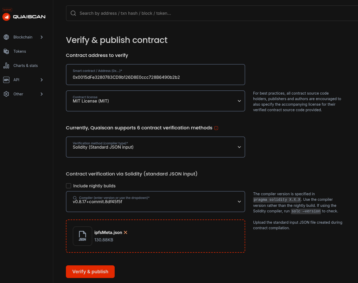 最後にipfsMeta.jsonをアップロードし、Verify & Publishをクリックしてスマートコントラクトを検証します。