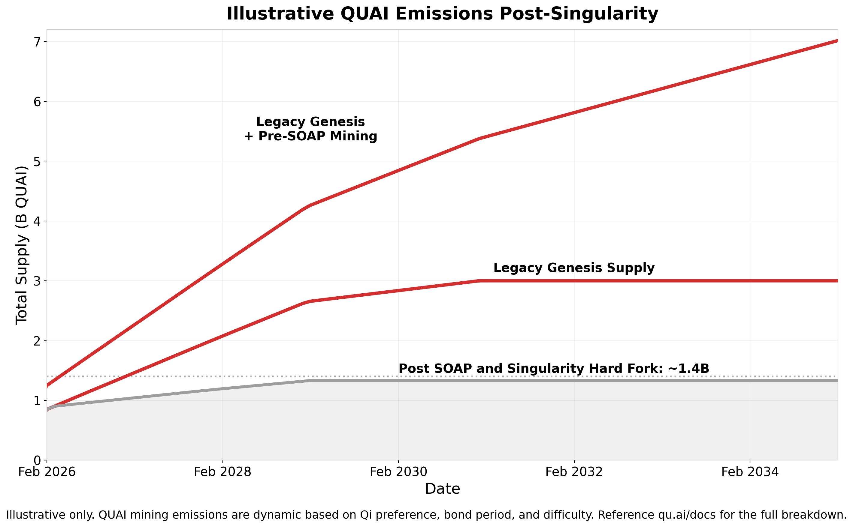 Quai supply changes over time from two sources: genesis unlocks and mining emissions. Two updates shape the current supply trajectory:- The Singularity Fork reduced future genesis unlocks by 1,667,159,984 QUAI (81.1% of future unlocks), shifting the vested baseline from 3,000,000,000 QUAI to 1,332,840,016 QUAI.