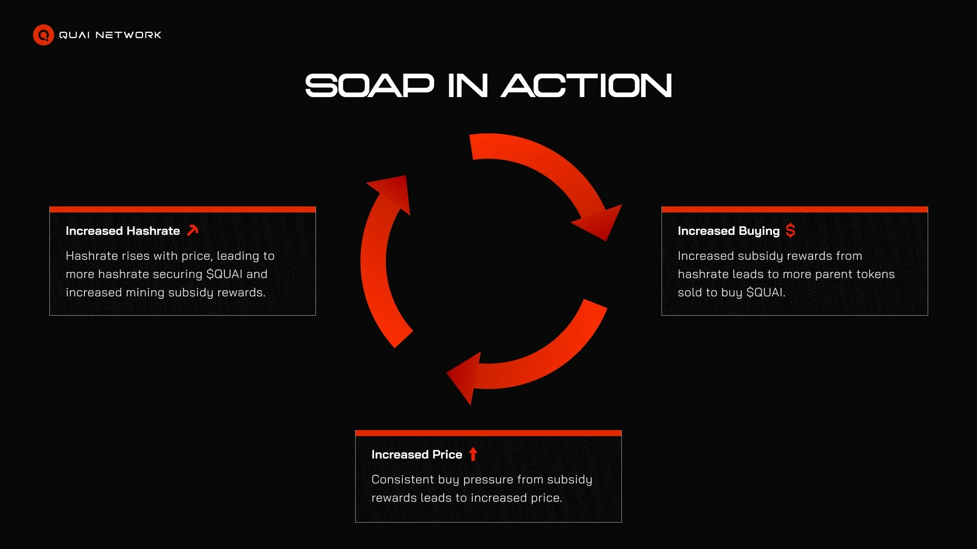 - SOAP funds open-market QUAI buybacks that are burned (100%). At ~180,000,000 QUAI/year, that is about 13.6% of the current post-fork baseline (~1.33B QUAI) burned annually.