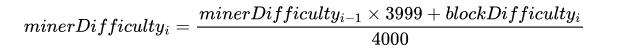 Miner difficulty at block i, denoted minerDifficulty_i, is calculated as an Exponential Moving Average (EMA) of prime block difficulty over a 4000-block window. This balances responsiveness to network changes with long-term stability: